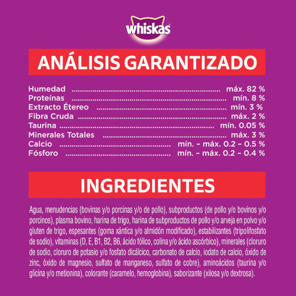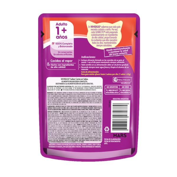 El sobre Whiskas para Gato Adulto sabor Carne x 85 g es una opción deliciosa y completa para mimar a tu felino todos los días. Su receta húmeda, tierna y jugosa, aporta hidratación adicional y nutrientes esenciales que ayudan a mantener a tu gato sano, activo y feliz.
