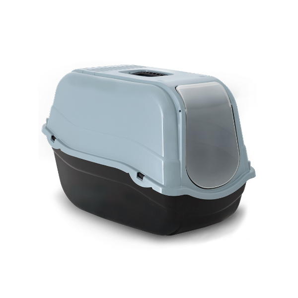 Cómodo y práctico baño cerrado para gatos, equipado con entrada con puerta y filtro antiolor de carbón activado. Está creado con superficies brillantes para facilitar la limpieza.